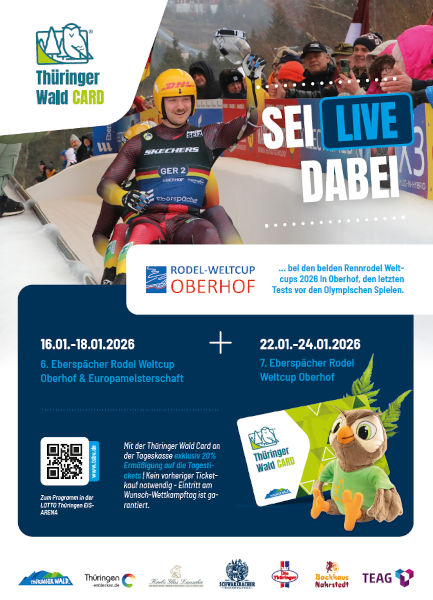 Gästekarten- und ThüringerWaldCard-Inhaber profitieren während der Rennrodel Weltcups 2026 von 20% Ermäßigung auf die Eintrittstickets.